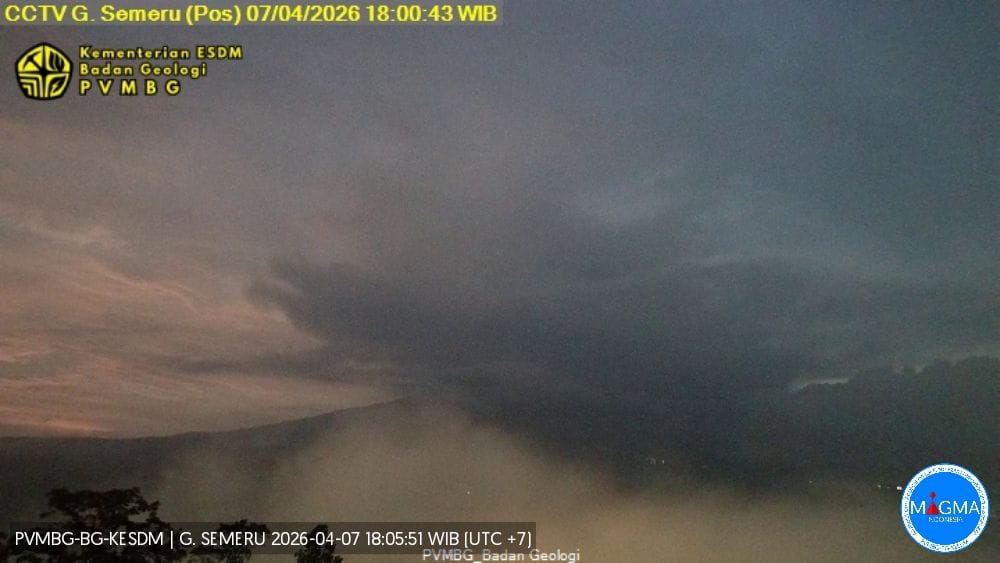 Lumajang, – Gunung Semeru kembali erupsi pada Selasa, 7 April 2026 pukul 17.30 WIB. Petugas PPGA Semeru, Liswanto, melaporkan melalui keterangan tertulis bahwa kolom abu teramati setinggi 2.000 meter di atas puncak 5.676 mdpl, berwarna kelabu dengan intensitas tebal condong ke arah timur laut dan timur. Erupsi terekam di seismogram dengan amplitudo maksimum 27 mm dan durasi 7 menit 23 detik.