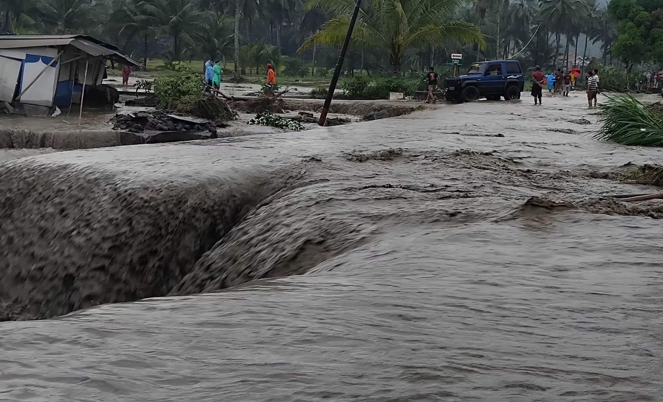 Debit air yang sangat besar, ditambah dengan material lahar berupa pasir, menggenangi jalan utama yang menghubungkan dua kecamatan tersebut.