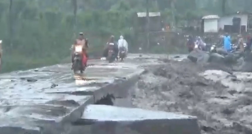 Para pengendara sepeda motor yang hendak melintas pun terpaksa menghentikan perjalanan. Jembatan yang biasa digunakan sebagai akses penghubung antarwilayah tertutup aliran lumpur tebal dan arus yang deras.