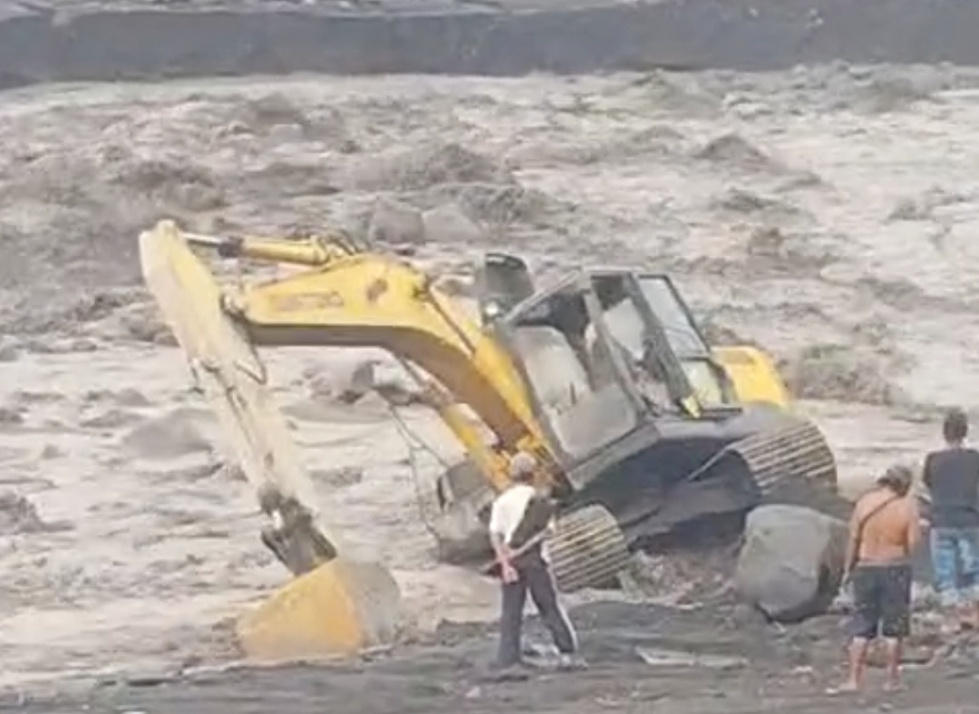 Arus deras yang membawa material vulkanik itu menyeret satu unit alat berat berwarna kuning yang berada di sekitar aliran sungai. Kejadian ini terjadi setelah hujan mengguyur kawasan puncak Gunung Semeru.