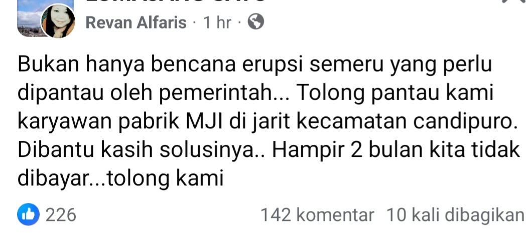 “Bukan hanya bencana erupsi Semeru yang perlu dipantau oleh pemerintah… Tolong pantau kami karyawan pabrik MJI. Hampir 2 bulan kita tidak dibayar…tolong kami dibantu kasih solusinya,” katanya saat dikutip, Rabu (7/1/2026).