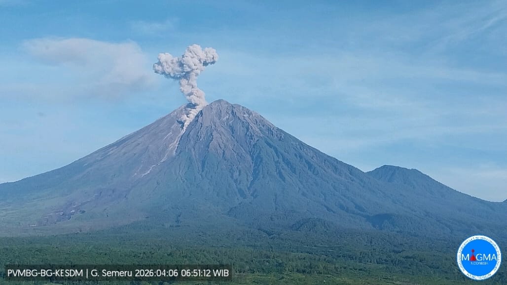 Lumajang, – Gunung Semeru di Jawa Timur mengalami erupsi pada Senin (6/4/2026) pagi pukul 06.51 WIB.
