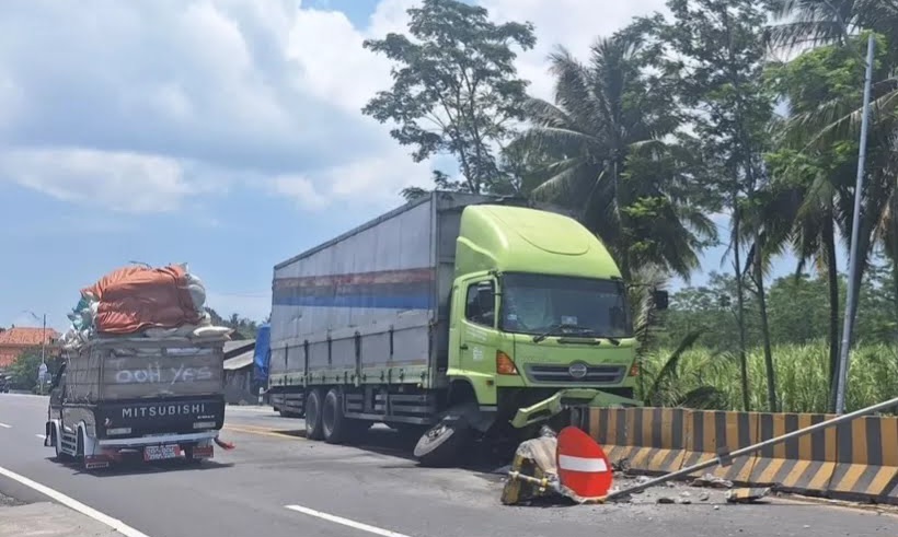 Truk menghantam pembatas jalan usai sopir berusaha menghindari kendaraan di depannya. Diduga, kecelakaan terjadi akibat sistem pengereman kendaraan yang tidak berfungsi dengan baik.