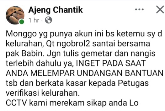 “Monggo yang punya akun ini bisa ketemu saya di kelurahan, kita ngobrol santai bersama Pak Babin. Jangan nulis gemetar dan nangis terlebih dahulu ya,” tulisnya.